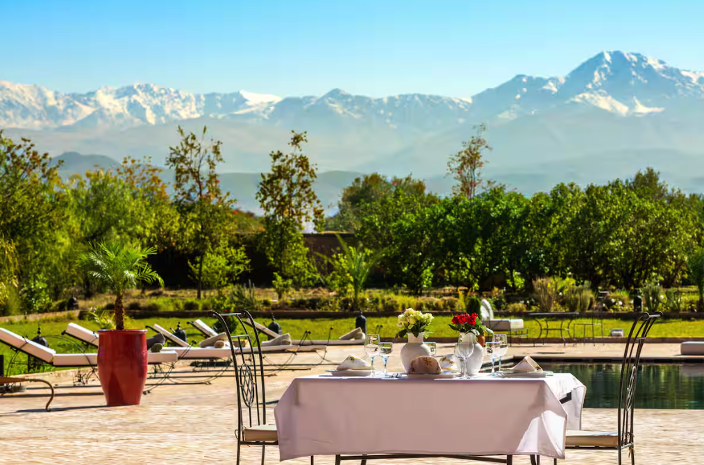 Tucked in the countryside just outside Marrakech, this sprawling private riad-style villa feels like its own estate: palm trees, terracotta walls, and a long south-facing pool with wide open views of the Atlas Mountains.