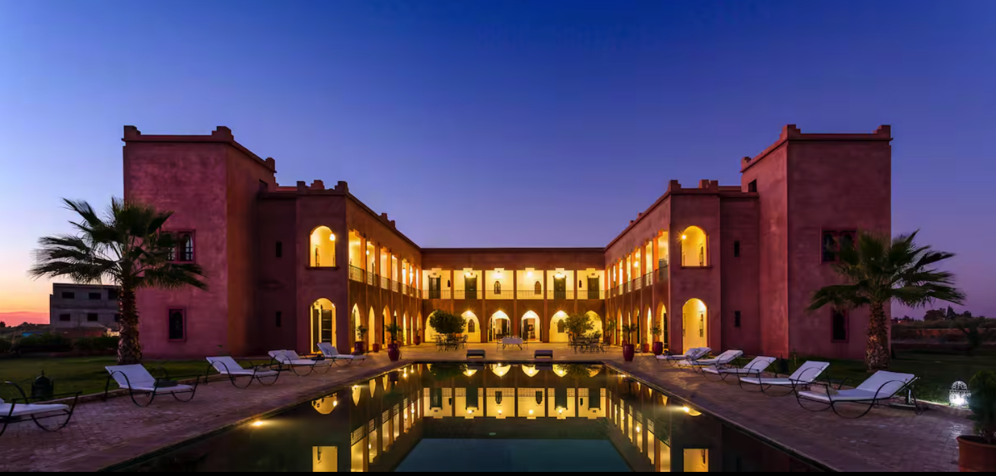 Inside, you wander through Moroccan salons and bedrooms dressed in carved wood, arched doorways, lanterns, patterned tiles, and Berber textiles, with courtyards and terraces offering space to connect as a group or disappear with a book.